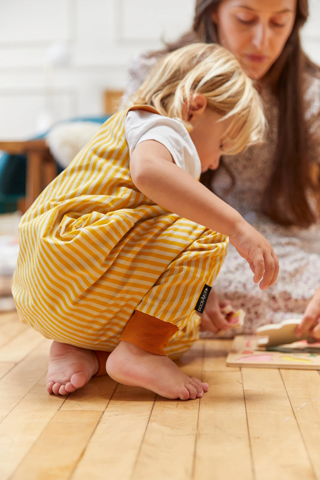 Little ones will earn their stripes with this modern take on a classic style. Our cabana stripes in a golden colourway, with a rich pumpkin spice interior as a perfect complement.