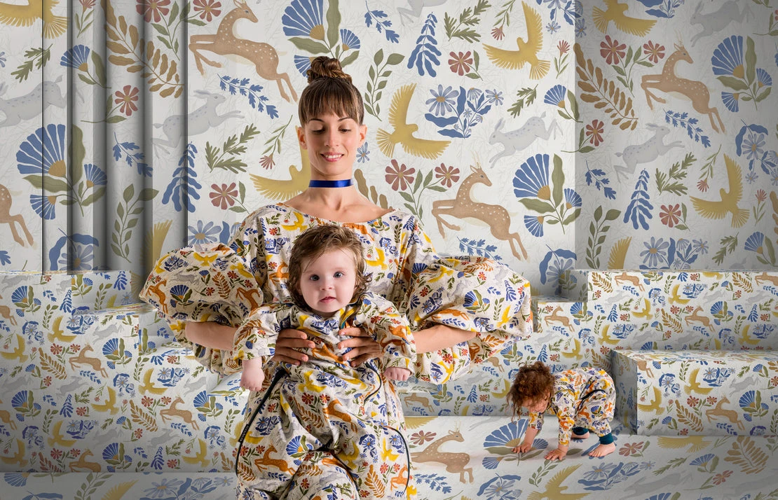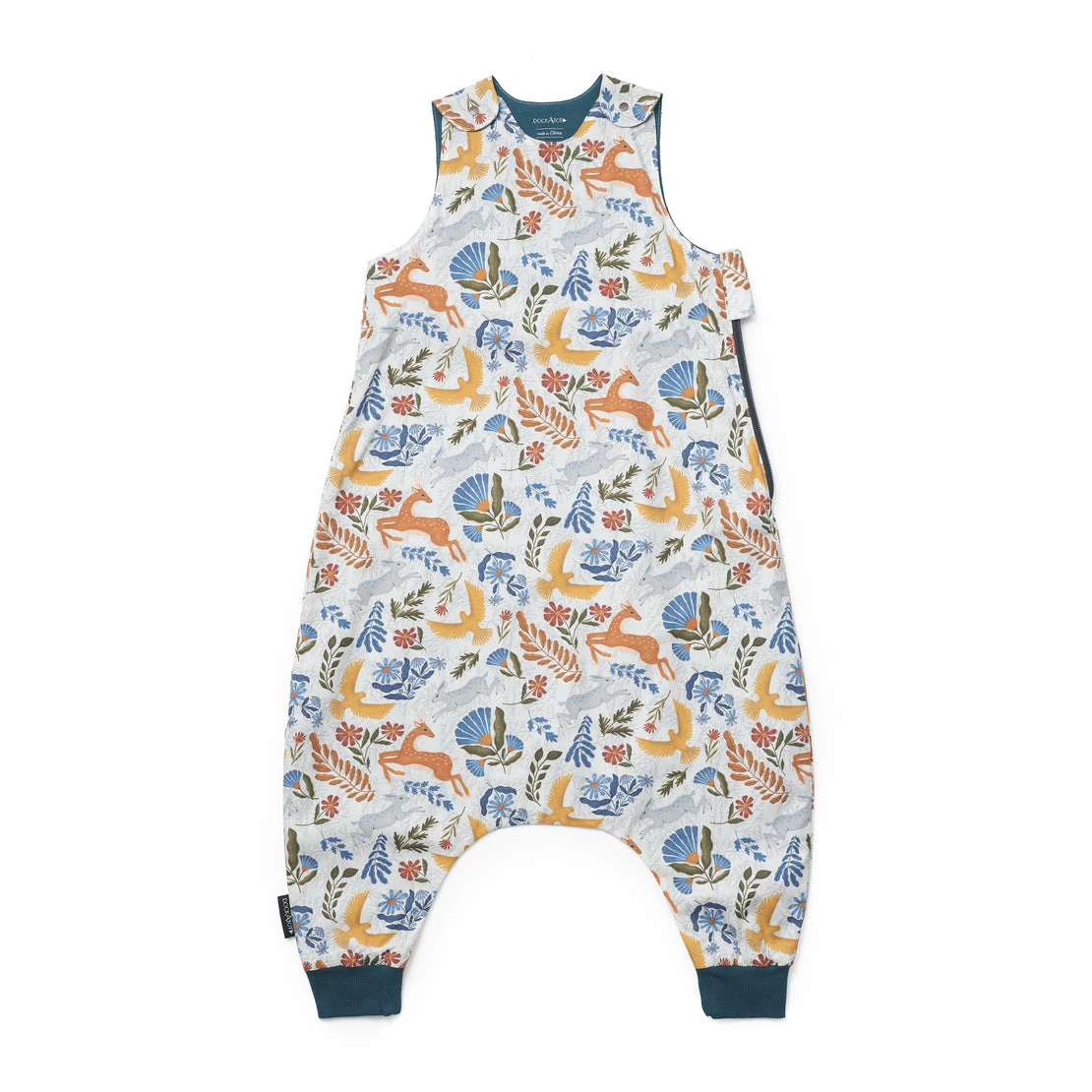 Forest wonders come together for this slumber party, complete with woodland animals, foliage, and familiar, warm tones. Deep teal brushed cotton jersey lines the interior, providing a perfect contrast for this playful design.