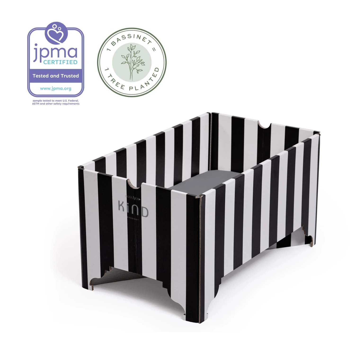 The Essential model features a rectangle shape with ornately crafted pedestal feet and thoughtfully designed prints that not only engage your newborn’s imagination but keep the home feeling stylish and chic. Includes supportive Sorona foam core mattress and (1) 100% cotton fitted sheet. Your purchase reflects your commitment to our planet and future generations as a tree is planted for every Kind Bassinet sold. Â