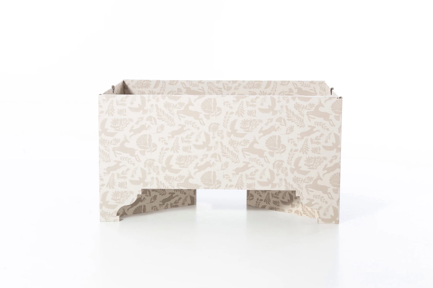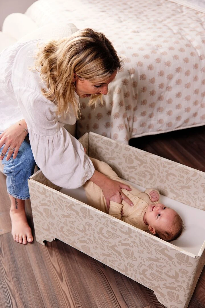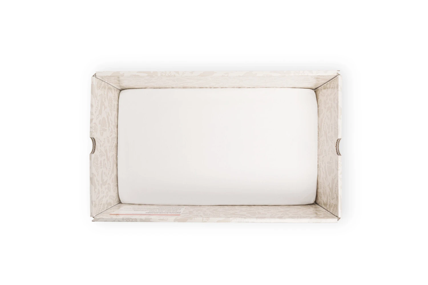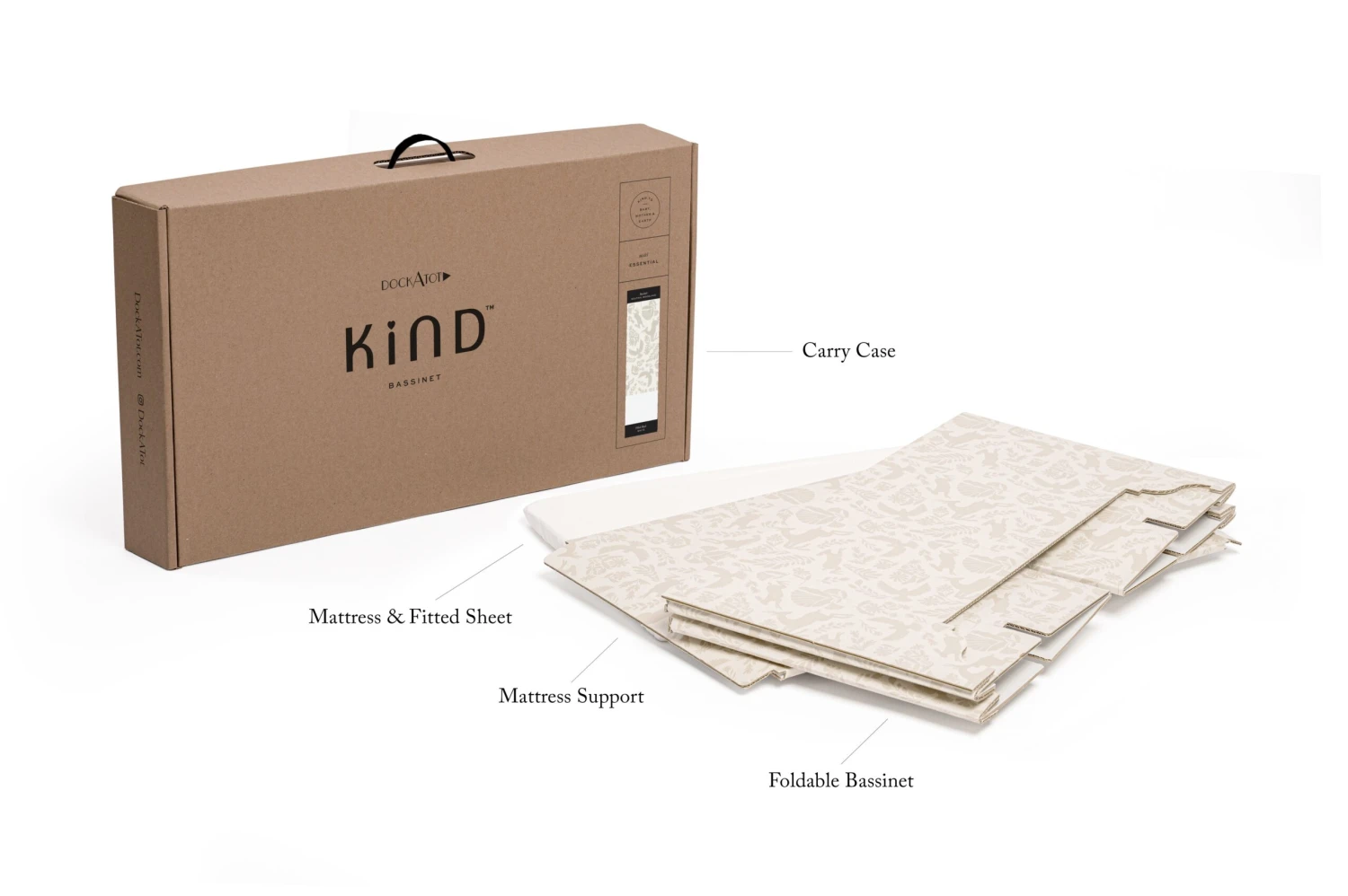 The Essential model features a rectangle shape with ornately crafted pedestal feet and thoughtfully designed prints that not only engage your newborn’s imagination but keep the home feeling stylish and chic. Includes supportive Sorona foam core mattress and (1) 100% cotton fitted sheet. Your purchase reflects your commitment to our planet and future generations as a tree is planted for every Kind Bassinet sold. Â