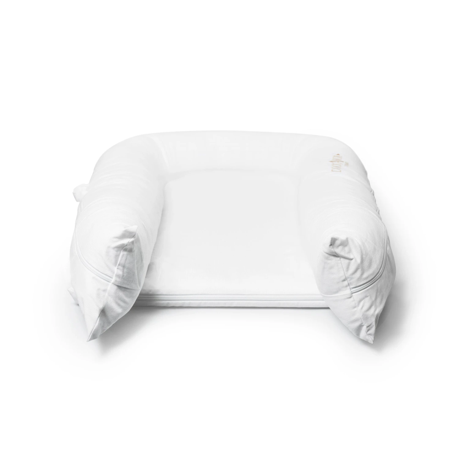 The Grand dock is our stage 2 lounging dock, 50% longer and wider, for tots age 9 months to 36+ months. The Grand size is an essential go-to spot for tots lounging around the house or when traveling. The built-in, air permeable side on the Grand dock gives little ones a familiar sense of security. For older tots, the Grand dock will help ease a child into their new setting when they are otherwise ready to sleep in a toddler bed. It provides a comforting and safe environment. Made in Europe. Features include air permeability and Oeko-Tex Standard 100 Class 1 certification (testing for harmful substances).